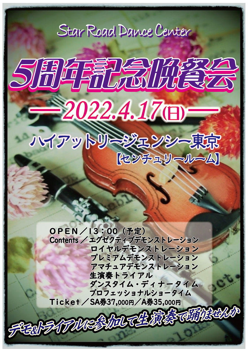 この度はスターロードダンスセンター5周年記念晩餐会へのご参加ありがとうございます。ダンスの文化発展の為に、ダンスと音楽を最も密接にと考え若手ダンスバンドと、社交ダンスのコラボレーションを企画致しました。若手バンドですのでこれからもっと技術も向上し、ダンス曲も増え、きっとダンス文化に欠かせないレジェンド的なダンスバンドになると期待しております。どうかこの機会にに私達の活動を応援して頂ければ幸いです。今回大きな会場で最も華やかなダンスイベントにする為、ハイアットリージェンシー東京に会場を変更しました。弦のカルテットを入れ14名体制のバンドの構成に致しました。急遽この体制に変更した為、曲のレパートリーは多少少なめですが一つ一つの音楽には力を入れ演奏致します。皆様の思い出の1ページに全力を尽くします。